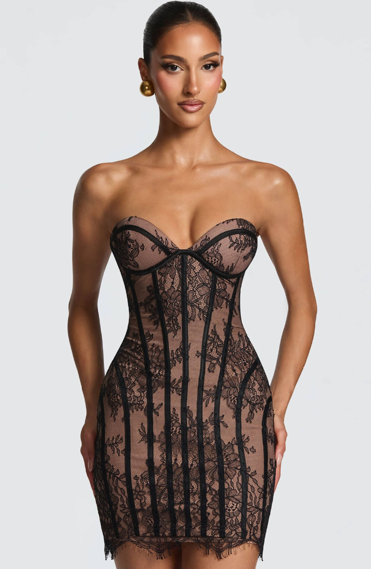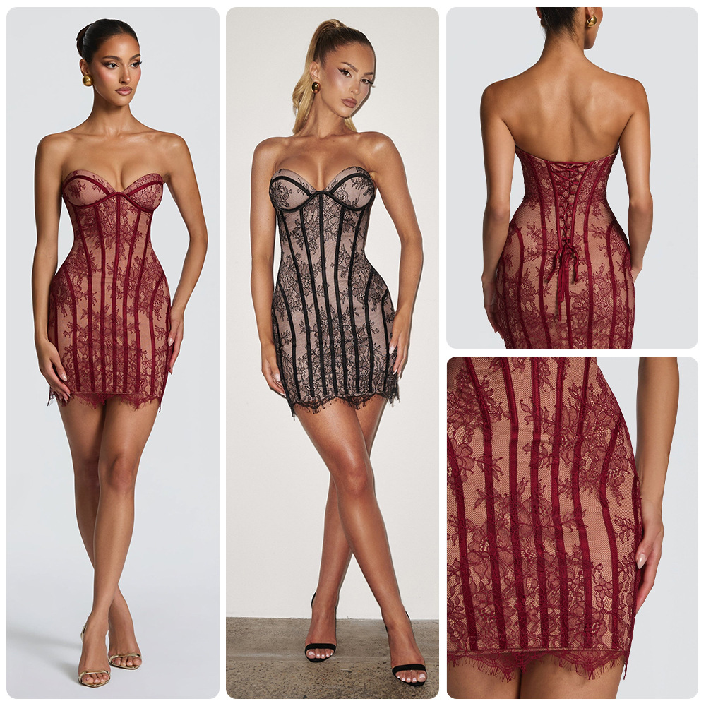 Style: Sleeveless, collarless bodycon dress with lace detailing
