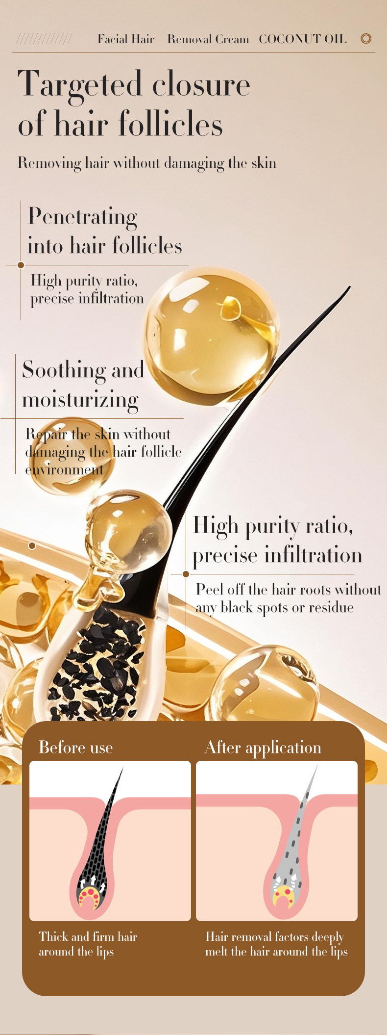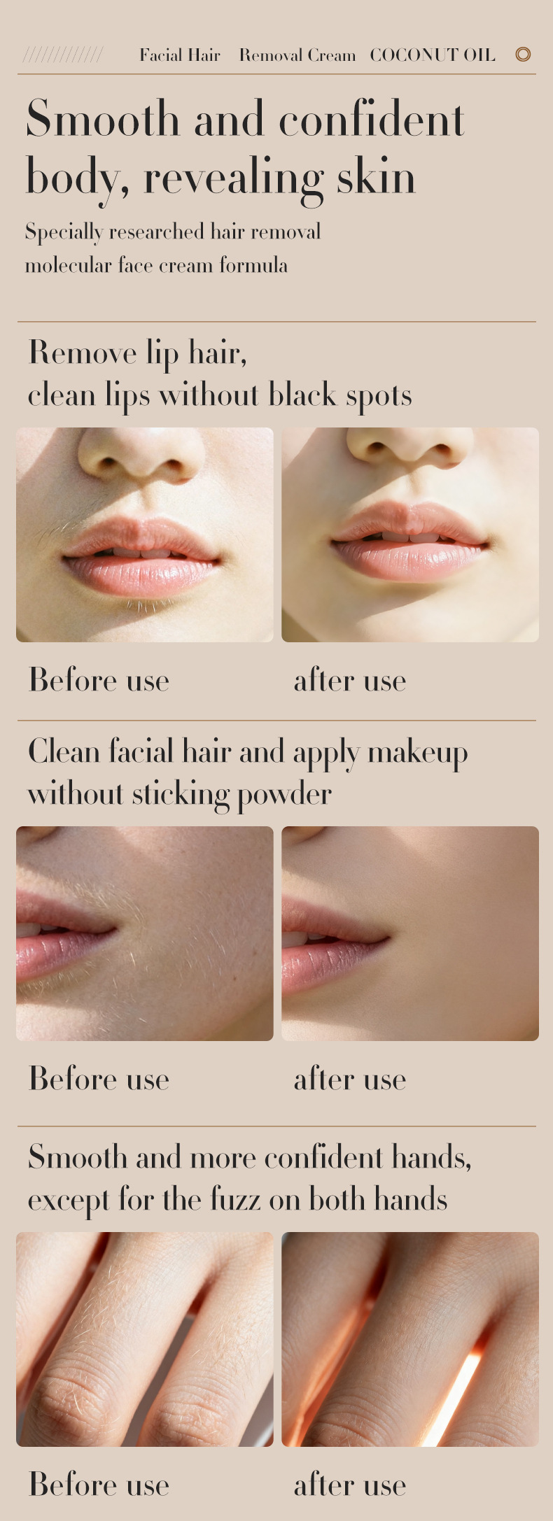 Coconut Oil Formula: Natural coconut oil base for gentle yet effective hair removal